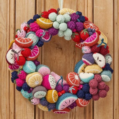 Have a fruitful summer with this wreath decorated with an assortment of colourful fruit slices, wedges and berries. This knitting pattern includes the instructions to knit a wreath cover, and all of the decorative elements you can see in the photograph which includes slices, wedges and halves of fruits including Apple, Dragonfruit, Fig, Grapefruit, Guava, Kiwi, Kumquat, Lemon, Lime, Orange, and Watermelon, plus other whole fruits including Blackberry, Blackcurrant, Blueberry, Cherry, Grape, Raspberry, Redcurrant and Strawberry. These decorative elements can also be used to decorate other projects, or use them to make brooches or decorate hair slides. Designed by Amanda Berry @fluffandfuzz, all pieces are knitted in 100% merino wool DK yarns on single pointed needles (not in the round). Some pieces are knitted tubes (i-cord) which is worked on two DPNs. You can choose how you cover your wreath with the decorative elements, copy this display or use your own design.