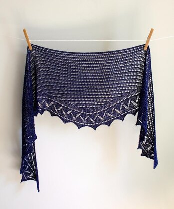 This fun sideways shawl has a light and airy body made up of eyelet rows and a cute zigzag pattern along its edge. It is suitable for any season but perfect for summer with its open, airy lace pattern. It is completely reversible and requires only one skein of yarn. Worked in one piece from end to end, the lace edging is worked along with the garter stitch body. Size is adjustable, based on how much yarn is used. One skein of Red Sock Blue Sock Yarn Basic Sock was used here but any fingering weight or sock yarn may be used.