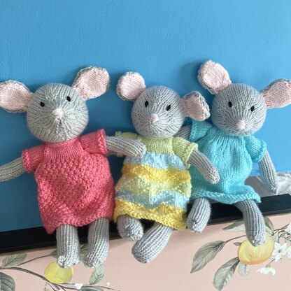 Easy to follow, this knitting pattern has clear line-by-line instructions along with plenty of photos to help you with knitting and making up. The pattern includes a choice of three styles of summer dresses ranging from the very simple (the plain turquoise dress), to intermediate (bobbly pink dress) to more complex (the stripy textured dress) but you will be walked through making them all step-by-step. You’ll need to be able to knit, purl, cast on and off, and increase and decrease to make these mice. All the pieces are knitted flat on 3mm straight needles so NO knitting in the round is needed.