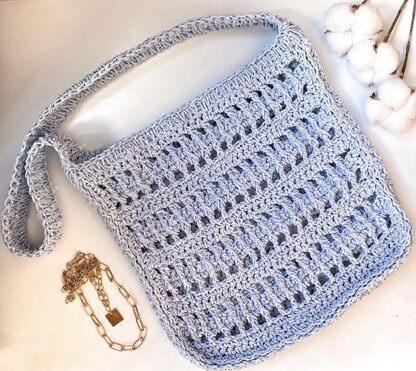 According to this pattern, you can make a bag of any size you wish. It will be a cute crossbody handbag or a large bag for going to the beach. The pattern is made out of gauge, so you can use any materials: raffia or 100% cotton (weight DK or sport).
