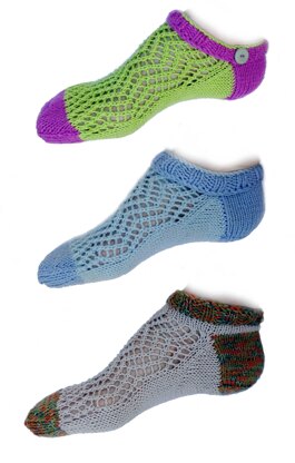 Make these s socks in any colour combination you like and then show them off in summer so shoes or sandals. The lace pattern keeps feet stylishly cool and the cuff can be worn up or turned down to reveal the contrasting colour edge.