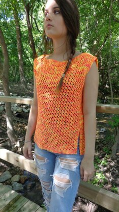 This is a light weight summer sweater with an all over lace pattern. Cotton and linen yarns can be used to make it even lighter. It is made to be worn with 2-6 inches/5-15cm of positive ease. It is worked flat in 2 identical pieces that are seemed to together at the top and sides. There is a 5 inch/13cm side split at the bottom on each side.