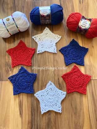 These Summer Star Coasters are a quick and easy way to add some patriotic style to your home. They work up very quickly and will look great at your next summer barbecue! Of course, you can always do them in other colors to fit in anywhere you want some starry sparkle. :) They would also make a pretty garland if you’d like to hang them instead. I think you’ll be happy with this pattern any way you choose to use it! The Stars measure approximately 5” from tip to tip. One skein of Lion Brand 24/7 cotton will make at least three coasters.