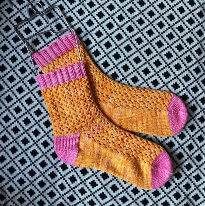 Summer steps are light socks, perfect for chilly summer evenings and knitting on the beach. A simple yet effective lace pattern is knitted all over.