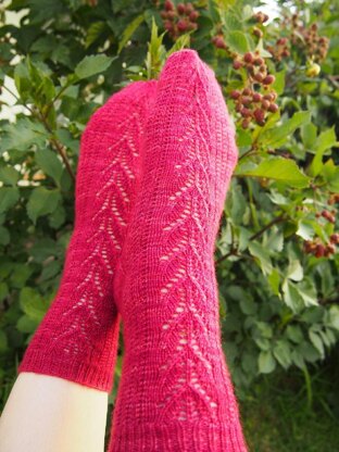 This sock was inspired by the berries of Summer. The centre lace pattern represents the inside of a cut strawberry, while the textured stitch on the remainder of the sock was inspired by the rows of a berry farm.
