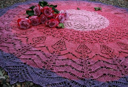 This circular shawl is knit from the center point out. Increases occur between each band of flowers to shape the shawl. It is worked in 5 rose-colored hues, with three different colors of seed beads to create tiny sparkles throughout the floral motifs. Please note the lace patterns are presented in chart form ONLY.