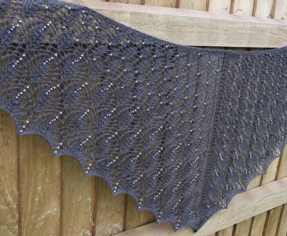 This pretty triangular lace shawl is perfect for a summer evening, or for adding a touch of sparkle to your party outfit in any season. It is worked from the top down, beginning with a garter tab. Beading is optional (although strongly encouraged!).