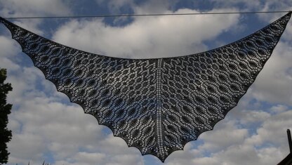 The finished shawl has a wingspan of 54”, and is 17” deep at the centre point. Pattern gauge is measured in terms of one single repeat of Chart B, which should measure 1 ¼” wide by 1 ½” high (3cm wide by 4cm high) after blocking. It is not essential to achieve exact gauge but it may affect your yardage requirements if you don’t.