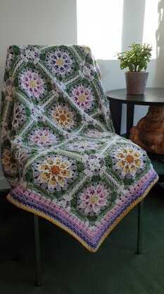 Blanket made up of pretty granny squares with a summery Dahlia motif in the centre.