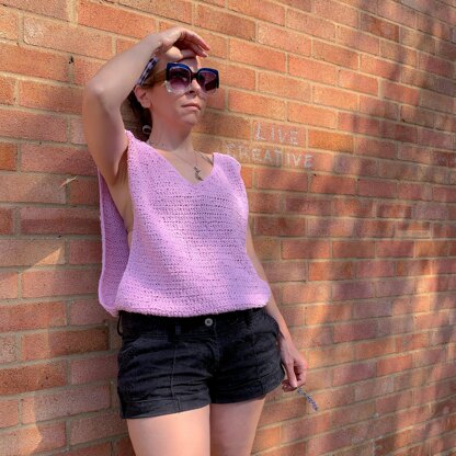 The Summertime Hangout top is a simple, relaxed v-neck vest, which is oversized to create drape over the body and left open at the sides for that on-the-beach summer vibe. (Though you can seam it if you prefer!)