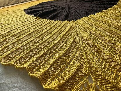 A request from a friend for a sunflower blanket was the perfect opportunity for this idea. Sun Chaser uses pi shaping and increases every other round for a squarish shape. Nupps are used to create the seeds.