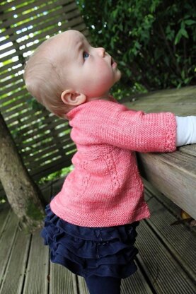 Sunburst - A feminine, open cardigan with 3/4 sleeves edged with lovely mock cables. This knit for girls is finished with easy to knit mock cables radiating across the back like a burst of sunlight.