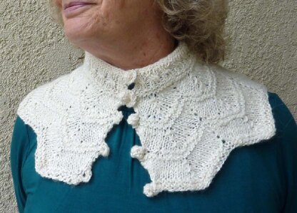Worked from the bottom up, this Victorian-inspired, lacy, mandarin-collared neckpiece fastens in front with self loops and bobbles, adding a dressy touch to a crew-neck tee, a scoop-necked blouse, or a jewel neckline dress. Worked in white, its rows of garter stitch remind me of foaming waves at the beach; its bobbles are little seashells.