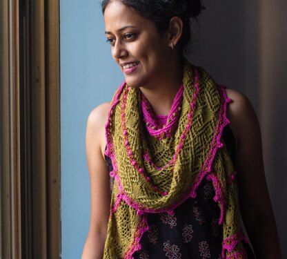 This is a top down crescent shaped wrap with some fun textures. The lovely lace pattern is an easy repetition of stitches and makes up the body of the shawl with some garter rows, nupps and bobbles thrown in for good measure.