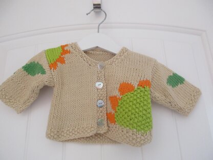 This is a pattern for a sunflower baby cardigan, part of the Spirit range of baby clothes, accessories and home knits. It is a simple shape with intarsia motifs, and moss stitch within some of the motifs, and moss stitch edging.
