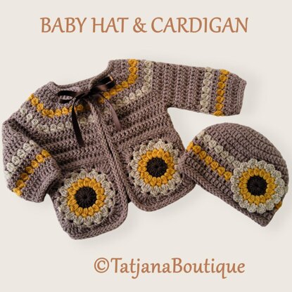 Crochet Pattern "SUNFLOWER" Baby Cardigan and Hat set decorated with crochet flower and satin ribbon. ♥♥♥ Size in this pattern 0 - 3 MONTHS. The pattern is written in US crochet terms but with a conversions at the beginning of the pattern to UK / Australian terms. Its just that some of the names of the stitches are different. Materials & tools you will need: ★ Acrylic or other yarn 150 gr approx. - DK, Double Knitting in UK, Light Worsted in the USA, 8ply in Australia. ★ Crochet hook size recommended 4.5 mm. ★ 50 cm satin ribbon. ★ Yarn needle to weave in ends. (optional)