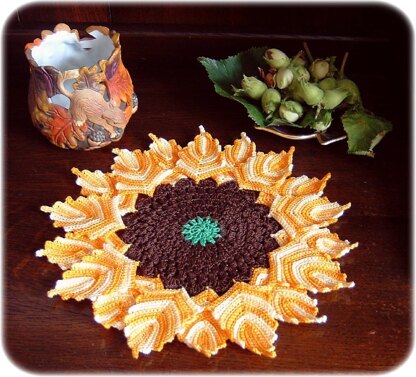 Materials required: 1.5 mm crochet hook, No 10 or No 12 crochet thread in yellow (approx. 309 yards/285 metres = 1 x 50g ball), brown (approx. 100 yards/92 metres), green (approx. 10 yards/9.25 metres.)