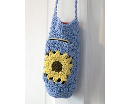 A little tote to carry your water bottle, with a sunflower pocket to carry your phone or cards, tissues, money, whatever you need. Pretty and convenient. The bag in the photograph is approximately 4 inches wide and 8 inches deep but the pattern gives instructions on how to change the size to fit your needs.