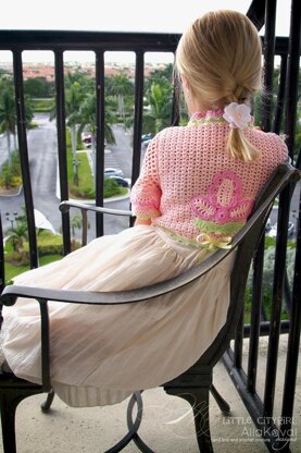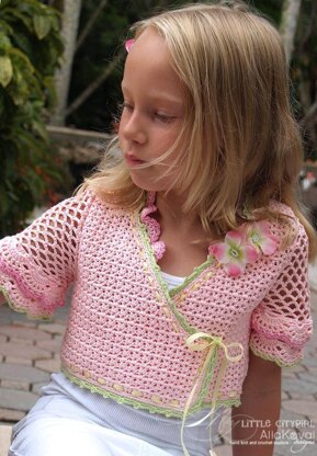 Soft as rose petals at dawn, this bolero is sure to win any little girl’s heart! The cropped bolero features dainty tiered sleeves, overlapping fronts tied with ribbon, and stylish flower accents at the neckline and on the back panel. Better yet, place the accents anywhere you please and make it truly one-of-a-kind! Worked in sport weight yarn, this irresistible piece will be the perfect addition to your little girl’s spring and summer wardrobe. As you know, now all my patterns not only include links to online stores, where you can purchase all available yarn and supplies used in the patterns with measurements in both metric and US systems, but also each pattern includes very detailed and clear stitch diagrams I started draw with Adobe Illustrator …one more realized dream ;o)