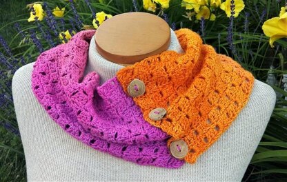 Wrap your neck in sunshine with this lightweight cowl. The stitch pattern is worked corner to corner, creating a diagonal color change when worked in gradient yarn. The blocks of double crochets create the buttonholes. Buttons on one end allow versatility to button the short ends together for a loop, or button into the long end to create a point that fits more snuggly around the neck.