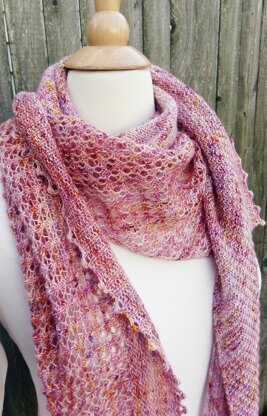 This shawl is an asymmetric triangle consisting of a garter rib pattern mingled with simple lace and finished with a picot bind off. These simplistic stitches also make the shawl reversible.