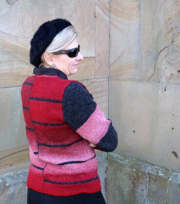 This design features an innovative way to use long-repeat or ombre yarns that makes a feature of the way the garment pieces fit together because there are no side seams in this design. Instead, the slow-changing colors of the yarn are shown off to great advantage where the two pieces of the body meet in the center-back seam.
