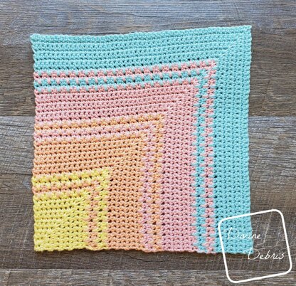 Please note: This pattern is free to view on Divine Debris dot com. This colorful and simple washcloth is perfect in a kitchen, as a pot holder, as a decorative or functional washcloth in a bathroom or to tuck into a spa gift basket. It works up so fast you could make many in different colors to match color decor in the home.