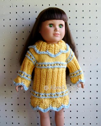 Easily knitted, stylish Doll Sweater Dress. This pattern is to make a Sweater Dress for American Girl or similar 18 inch Doll. The dress is worked flat, back and forth in rows. Body of dress is worked in one piece from bottom to armholes, then front and backs are worked separately. Sleeves are worked from cuff to armholes, and seamed at completion. The sweater dress includes back button closure with buttonhole placement.
