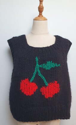 This beginner-friendly knitting pattern creates a versatile super chunky tank, perfect for layering. The tank is worked flat in two separate pieces, front and back, making it a straight-forward project for those comfortable with basic shaping. Once the main body is complete, stitches are picked up to add ribbed trims at the neckline and armholes. The cherry motif is worked following a template included in the pattern, stick with classic red cherries or get creative with bold colour combinations (looks great in fuchsia).