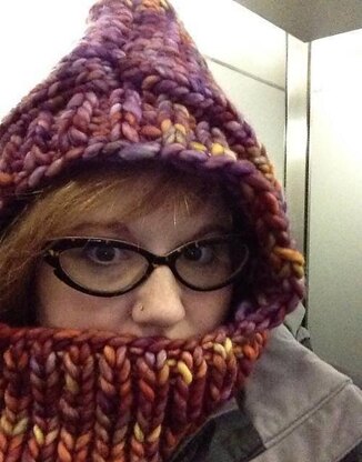 This is a soft, fluffy, and most importantly very warm hooded cowl that knits up in a hurry using super bulky yarn and large needles. The hood is made by picking up stitches from the top of a basic ribbed cowl, with a seam along the top. A ribbed brim finishes it off and covers as much of your head as possible to keep out the winter chill. It’s plush enough to keep you warm on its own, but roomy enough that you could wear another hat underneath to bundle up extra hard.