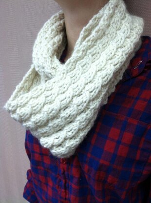 A nearly reversible infinity scarf in a mock cable lace pattern. It knits up very quickly and as the name suggests is both super cozy and fabulous.