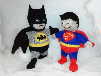 I have designed these 2 child safe toys that stand around 20cm tall using double knitting yarn on 2.75mm straight needles. They each use around 25g of yarn in various colours. I have included basic charts for the logos as well as written instructions. Batman's cape and mask are knit separately to the main body and can be slipped on and off. Ideal for young children as all details are knit (apart from the eye centre which is embroidered).