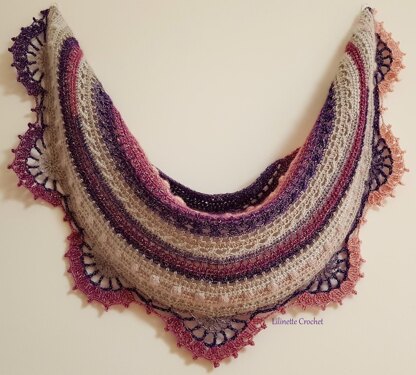 | One size only: | This crescent wrap is 112 cm wide (about 44 ½") and 55 cm deep (about 22 ½")- measured in the center. It can be easily adjusted to different lengths and widths by adding or subtracting pattern repeats. |