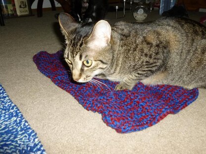 Since every time I knit a Susan's Squares Afghan, the cats try to steal it, I decided to make a scaled-down version for them. It can be knit with bulky yarn or two strands of worsted weight held together (I prefer the latter).