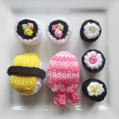 A sushi platter feast! For a quick stash busting project, on the menu today are sushi rolls and nigiri. Most pieces are worked flat (back and forth) on a pair of single pointed knitting needles, not in the round. The sushi roll fillings are i-cord tubes worked on two DPNs. Designed by Amanda Berry @fluffandfuzz, these are knitted in acrylic DK yarns, and you only require a few grammes in each colour. For confident beginners and above, other techniques used include casting on and off, knits, purls, increases and decreases, and a little seaming to finish.