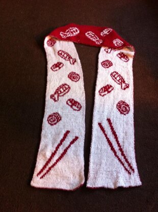 Declare your love of sushi with this adorable scarf! This scarf features three adorable sushi motifs and is the perfect weight for warding of a light chill.