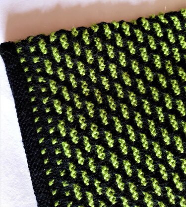 The Sussex Cowl is worked in a striking mosaic design. It is a quick and simple knit that uses only one colour per row.