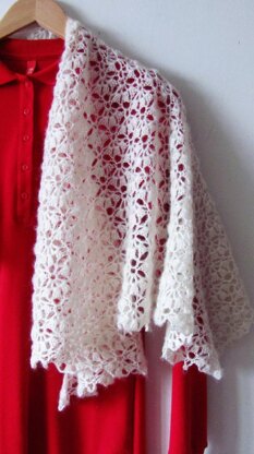 Swan Lake is a modified triangle-shaped shawl crocheted from top to down. Curved top edge helps it perfectly stay on the shoulders by itself. Delicate flower stitch and fine mohair work to give you an airy, lightweight and elegant shawl.