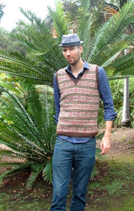 This is a pattern for a Fair-Isle style slip-over/vest. It is worked in the round and from the bottom up. The neck and armholes are worked with steeks. After the steeks have been prepared and cut, the neck and armhole ribbing is worked.