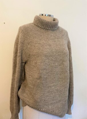 The sweater is worked seamless from the top down. Collar is worked first in rib pattern then yoke is started with a few shortrows to raise back. Garment is continued to be knit to underarm. Sleeves are separated out before body is completed. Sleeve sts are later picked up and finished last in the round. The size and length of the garment can be easily adjusted by increasing or decreasing to your liking and the length can be made to suit.