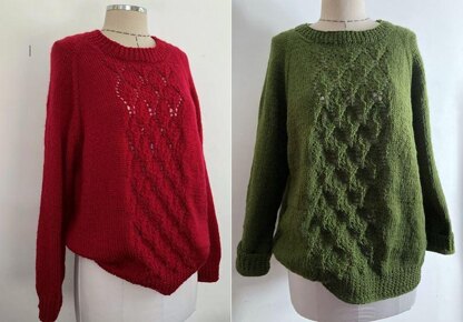 DIMENSIONS: Finished Bust Circumference approx.: 35 (37.5, 39.5, 41) 43.5, 47.25, 51, 57, 61”/89 (95, 100, 105) 110, 120, 130, 145, 155cm (Suggested Ease: +6 to 8” take actual dimens. and choose a size according to desired ease) Length overall, customisable: 20.5 (20.9, 21.7, 22) 22.85, 23.5, 24.5, 24.5”/52 (53, 55, 56) 56, 58, 60, 62, 62 cm Sleeves: 18”/45cm or desired length