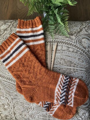 Sweater Weather Socks is all about having fun with pattern. The pattern written in 3 sizes; across 56, 64 & 72 sts. Best of all, the pattern is written for **both toe-up and top-down knitting**. There’s something for all sock knitters!
