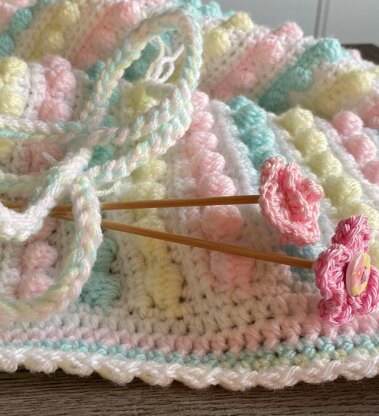 I have loved designing this very pretty and tactile baby blanket, perfect to snuggle under with smooth side against your babies skin and then lovely bobbley stitches on the right side. Perfect size for car seats, prams and cribs.