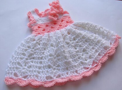 This dress is very special. It is a beautiful and elegant, perfect for any special occasion- Christmas, a birthday and lots more! Made in white soft acrylic yarn with a beautiful pink crochet flower detail . Dress ties in a pink ribbon in the back.