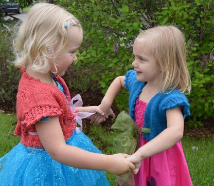 This sweet little sweater knits up quickly in a luxury yarn and is perfect for a special girl to wear over her favorite twirly dress. The pink sweater shown was knit using a silk blend while the blue was knit with a luscious angora. This seamless sweater is worked flat from the top down. The back and two front pieces are worked separately until the arm hole is completed, and then are joined and the body is worked in one piece to the hem. Stitches are picked up for the sleeves which are worked in the round, with short row shaping.