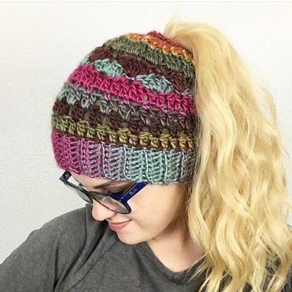 This messy bun hat pattern looks complicated, but is so easy to make! The self-striping nature of the yarn and the combination of stitches look so amazing that this hat is sure to be a hit whether you're giving it as a gift, selling it at a craft fair or making for yourself.