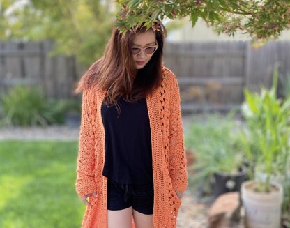 The Sweet Marmalade Cardigan is a fun, lacy cardigan that can be easily adjusted for any size and comes with a standard sizing chart for women.