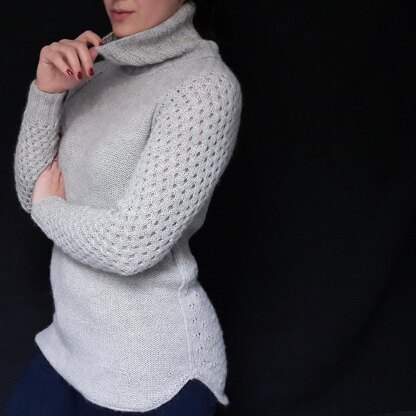 This sweater is worked seamlessly from top down. First the yoke is worked back and forth on the needles, then joined and worked in the round. The yoke is formed using the raglan shaping method. From the underarms, the body is worked straight with no shaping. The garment features a longer back and rounded hems on both front and back. The hem stitches are bound off with an i-cord. At the end, a crochet slip stitch is applied around the edge of the neck from which 2 layers of stitches are picked up (one at a time), worked for 3 rounds, then joined together to form a single layer again. After that, the neck is finished in 3x3 rib. This technique allows for the edge of the neck to be enveloped in 2 layers of stocking stitch fabric which gives it a crisp and neat finish. It’s a good idea to take advantage of the sweater’s top down seamless construction and periodically try it on to be able to adjust the overall length of the body or sleeves if desired.