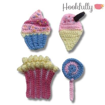 This crochet pattern bundle will help you create sweet treat appliqués for: - Ice cream appliqué - Cupcake appliqué - Lollipop appliqué - Popcorn appliqué The appliqués can be sewn onto almost any of your crochet creations to make them look pretty. Please note the blanket pattern is NOT included in this bundle. DK (weight 3) yarn. I used ‘King Cole Pricewise DK’ in 7 colours. Cupcake - 15m / 16yd / 5g Popcorn - 23m / 25yd / 8g Lollipop - 7m / 7yd / 2g Ice cream - 12m / 13yd / 4g Total - 57m / 61yd / 19g Supplies you will need – Crochet hook 3.5mm & 4mm – Tapestry needle – DK yarn – Stitch markers (optional) – Scissors Recommend skill level is easy. The pattern is written in USA terminology. You will need to know basic crochet stitches (sc, hdc, dc, tr) as well as the popcorn stitch. You’ll also need to know how to work into a magic ring, front/back loops and raw edges. The pattern is 10 pages long and includes progress photos, gauge instructions and measurements.