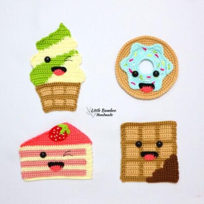 Set includes 4 patterns : 1. Waffle 2. Doughnut 3. Cake 4. Ice-cream Materials: • 4 Ply Fingering acrylic or milk cotton yarn • flat bottom black eyes ( 6 )